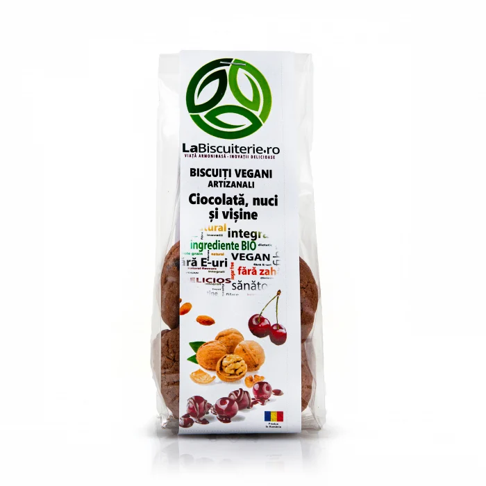 Savureaza o combinatie plina de textura cu biscuitii vegani Ciocolata, nuci si visine de la LaBiscuiterie.